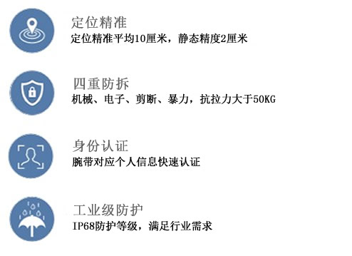 電子身份防拆腕帶是針對監(jiān)管業(yè)務(wù)設(shè)計的精準(zhǔn)定位監(jiān)管 設(shè)備,能將佩戴人員的位置信息實時上傳。 電子身份防拆腕帶擁有IP68工業(yè)級防護(hù)等級,能在多 種環(huán)境下保證10至12個月的長期續(xù)航。 內(nèi)置NFC,可與現(xiàn)有門禁、消費、醫(yī)療系統(tǒng)等多種系統(tǒng) 無縫融合,擁有強大的擴(kuò)展應(yīng)用能力。